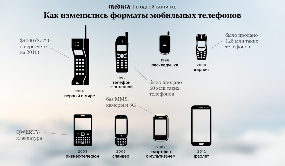 Первый мобильный телефон, который можно было удерживать одной рукой, весил около 790 граммов. Пять лет понадобилось для создания модели, которая весила бы втрое меньше и умещалась в кармане рубашки. Современные телефоны мощные как компьютеры, весят меньше 200 граммов.