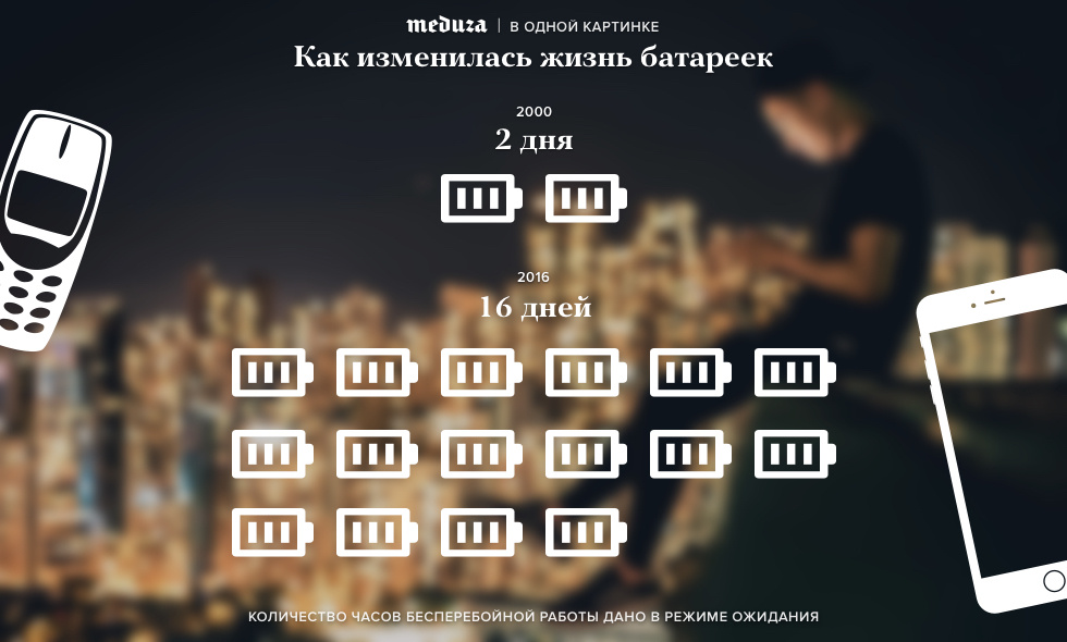 Сначала мобильников едва хватало на час разговора. В 90-х появились модели, живущие неделю без подзарядки. А современный телефон, если не пользоваться всем многообразием функций, может ждать звонка больше двух недель.