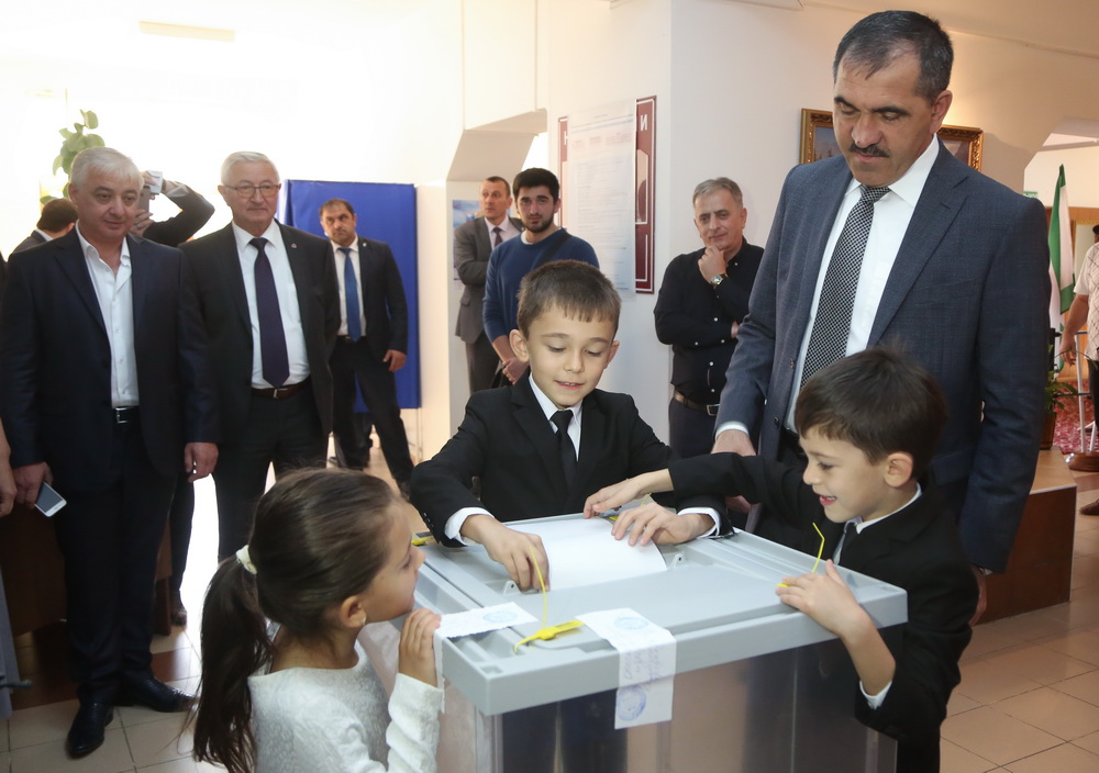 Глава Ингушетии Юнус-Бек Евкуров голосует на выборах. Магас, 18 сентября 2016. Фото пресс-службы главы РИ. В Дагестане «Единая Россия» набрала почти столько же — 75,51%. Явка тоже впечатляет, 88,13%. Но парламент Дагестана решено сделать трехпартийным: у «Справедливой России» 10,45%, у КПРФ 9,14%. Среди малых партий больше всего у «Партии возрождения России», 1,52%, у остальных — менее 1%, в том числе у ЛДПР всего 0,64%.