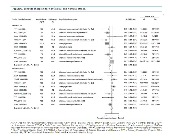 К этому вопросу обратились специалисты по общественному здоровью, которые стали эти исследования обобщать. Из этого отчета я взял таблицы. Специалисты американского центра по профилактике обобщили все данные по первичной профилактике болезни аспирином. Первичная профилактика – это когда люди, у которых нет болезни, пытаются ее предотвратить, чтобы ее и дальше не было. А вторичная профилактика – это когда у человека уже есть, допустим, стенокардия, или на кардиограмме выявляются какие-то проблемы, и он начинает принимать аспирин, чтобы предотвратить развития у себя инфаркта и инсульта. То есть, он уже больной, но он предотвращает осложнения.
