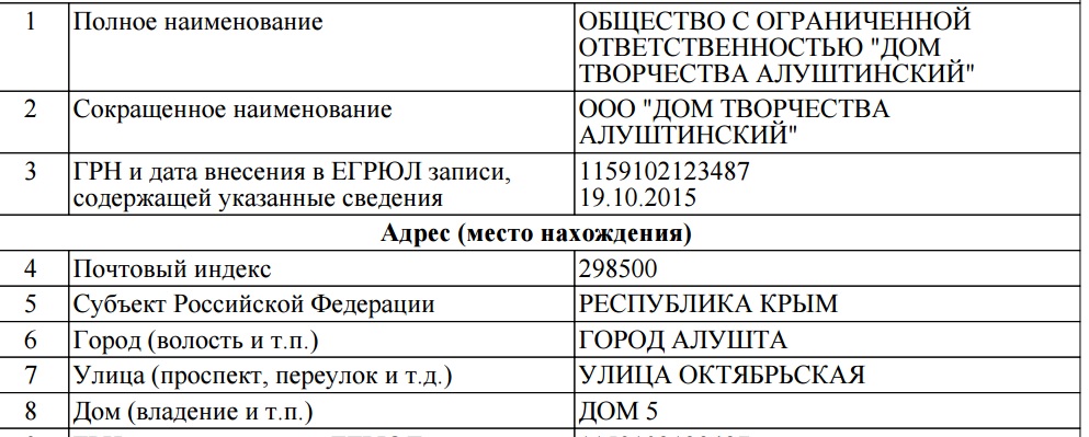 ООО «Дом творчества Алуштинский» зарегистрировали в октябре прошлого года в Алуште по адресу улица Октябрьская, 5. Помещения принадлежат санаторию «Алуштинский», который до российской аннексии Крыма являлся собственностью Госуправделами президента Украины (этот же собственник в украинском реестре остается и сейчас). Впоследствии российские власти передали его в ведение Управделами российского президента. Но уже в марте прошлого года появился загадочный инвестор, который заявил о намерении реализовать здесь проект по созданию Дома творчества. Ради этого Совмин инициирует отмену решения о передаче санатория Кремлю и в судебном порядке возвращает его в собственность Крыма.