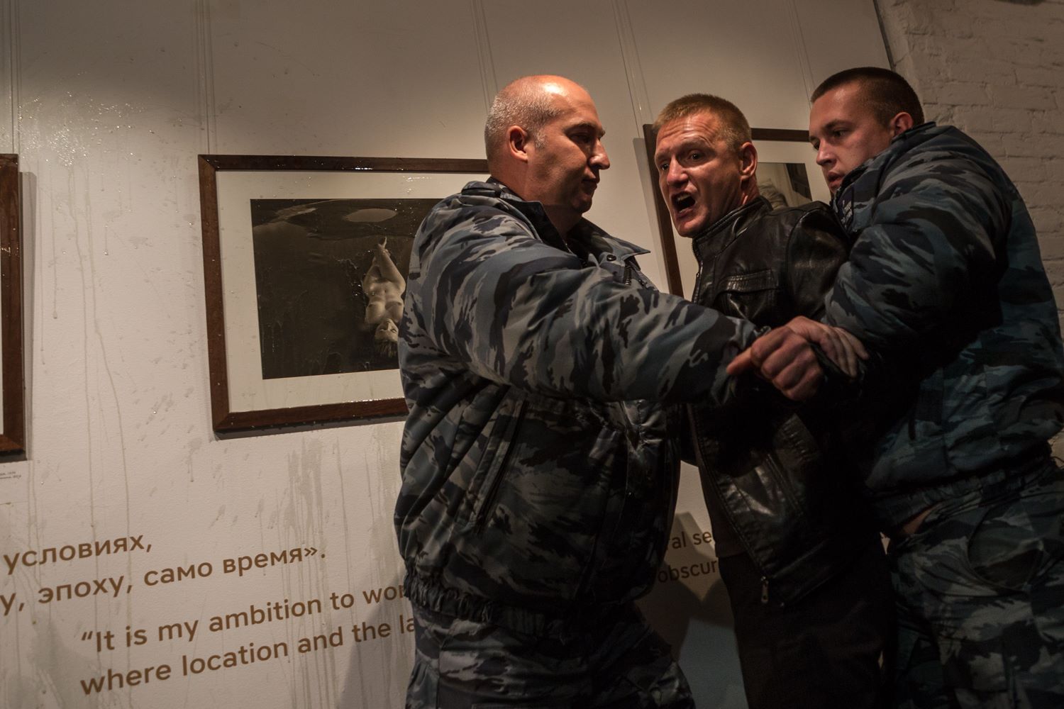 На выставку через оцепление «офицеров» проникают муниципальный депутат Игорь Брумель и его знакомый — Александр Петрунько. Петрунько обливает несколько экспонатов мочой. «Офицеры» задерживают Петрунько и передают полиции.