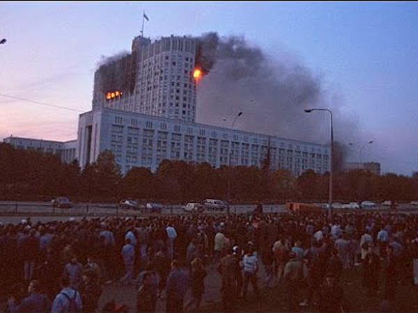 Горящий Белый Дом во время событий октября 1993 года / YouTube.com Сам я всегда относился к тем, кто считал эту меру – стрельбу по зданию парламента – вынужденной и был на стороне Ельцина. И хотел бы сейчас сказать, не ревизуя этих своих взглядов: на мой взгляд, ошибкой демократов было то, что они считали самым главным для демократии оставить власть в руках демократов, а не в руках демократических институтов.