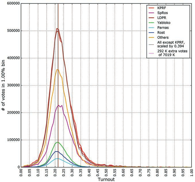 В результате исключения голосов за «ЕР» первый пик распределений ожидаемо сместился с явки 37% на 22%, второй «горб» на высоких явках магическим образом исчез, и распределения голосов за все партии оказались простыми колоколообразными кривыми (читатель ждет уж слова «Гаусс» — его не будет).