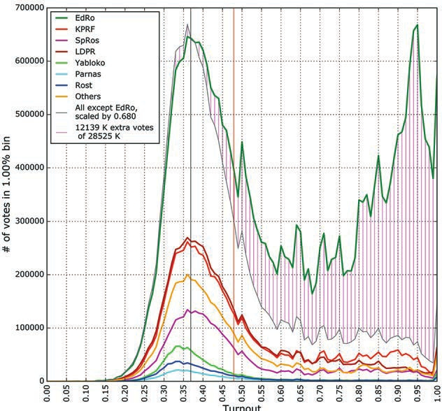 Мы в очередной раз убеждаемся, что избиратели «Единой России», голосующие на участках с высокой явкой, — это (по крайней мере, частично) особенные избиратели со своими самобытными привычками и закономерностями голосования. Можно, конечно, сделать крамольное предположение, что это никакие вовсе и не избиратели, а фантомные голоса, нарисованные или вброшенные руками фальсификаторов выборов [1]. Тогда, как и прежде, можно определить их количество, вычтя из распределения голосов за «ЕР» по явке распределение голосов за другие партии, масштабированное таким образом, чтобы они совпадали в главном пике. Разность показана на рис. 1 розовой штриховкой. Она соответствует 12,1 млн «фантомных» голосов за «ЕР» из 28,5 млн в общей сложности поданных за эту партию — почти 45%.