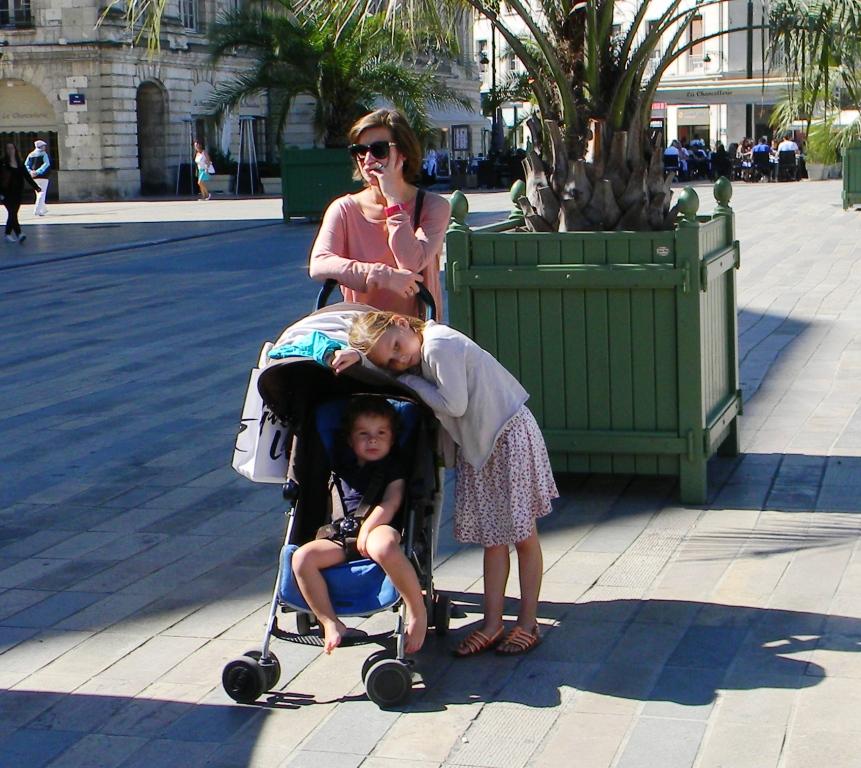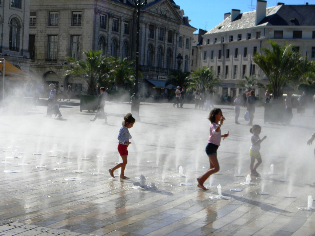 А рядом неспешно и размеренно течёт жизнь. Молодёжь тусуется прямо у подножия каменной Жанны, мамы возятся с детьми, а малышня гоняет на самокатах и подставляет свои тела под холодные фонтанные струи.