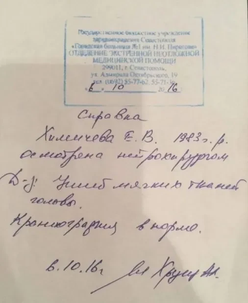 После произошедшего Химичева направилась в севастопольскую городскую больницу имени Пирогова снимать побои. Врачи зафиксировали ушиб мягких тканей головы. С заключением медиков женщина обратилась в полицию, сейчас правоохранительные органы ведут проверку случившегося.