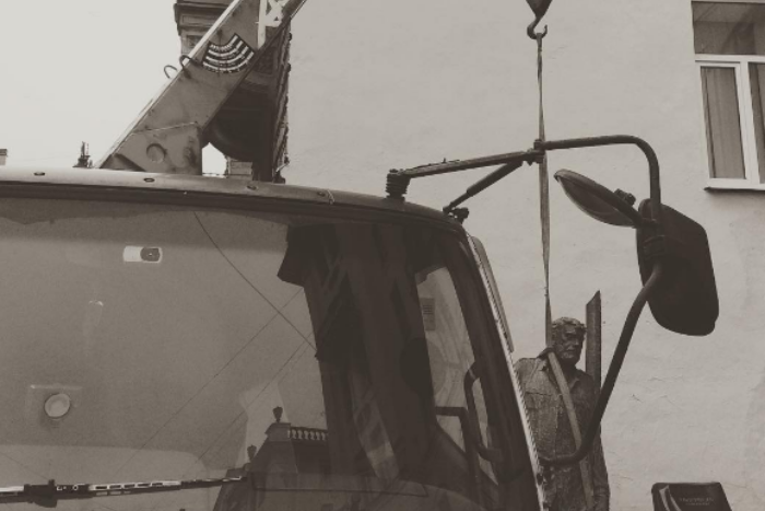По словам очевидцев, перед тем, как памятник прикрепили к крану, он упала в кузове погрузчика.