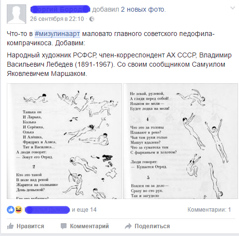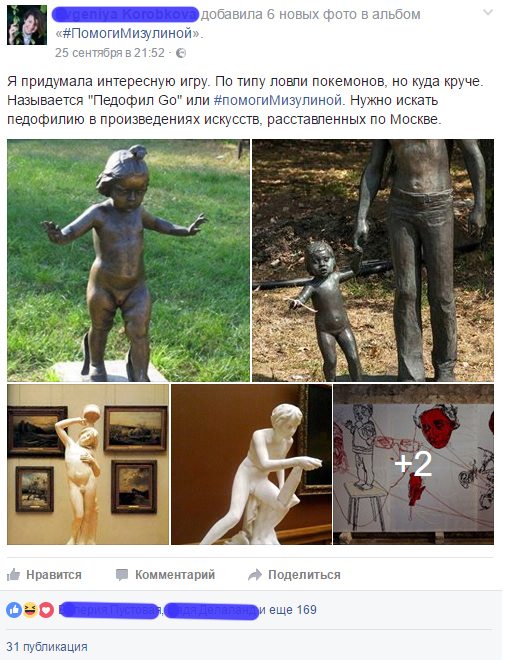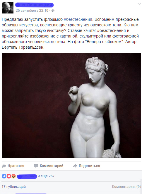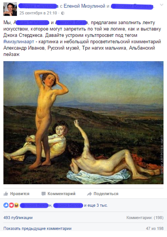 Практики противников (второе «дискурсивное сообщество») сделаны по иному принципу. Они используют более тонкие и сложные орудия, чтобы подорвать властный дискурс изнутри. Почти серьезный тон призывов массово публиковать известные произведения с обнаженным телом под хэштегом #безстеснения сменяется перформативным игровым характером постов #мизулинаарт, #Помогимизулиной.