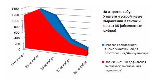 Сторонники табу, образующие первое «дискурсивное сообщество», в основном прибегали к использованию оскорбительных наименований, идущих из дискурса власти, к таким хэштегам и клише, как, например, «педофильская выставка». Это обвинение прямое, которое не хочет маскироваться, оно совпадает с официозным запросом на нравственность, делается с позиции силы и поэтому позволяет себе быть прямолинейным.