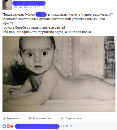Поиск союзников толкает людей к участию в проективной солидарности. Так, после обыска и ареста в Библиотеке украинской литературы пользователи Фейсбука начали выставлять фотографии своих украиноязычных книг; когда продавщице в Екатеринбурге предъявили обвинение в распространении «экстремистского демотиватора», многие пользователи призвали к массовому репосту этого текста. Ровно так же в нашем случае обитатели Фейсбука стали выставлять свои «порнографические» фотографии в младенческом возрасте и призывать других делать то же самое. Темы, которые были вытеснены представителем власти из пространства искусства, немедленно оказались включены пользователями Фейсбука в личный контекст. Выставленные на всеобщее обозрение, они только усилили конфликт, вынесли его из «защищенного» пространства музея в «опасное», публичное. Мы можем прочитать это как сообщение: «Вы запретили нам делать это там, теперь мы будем делать это здесь».