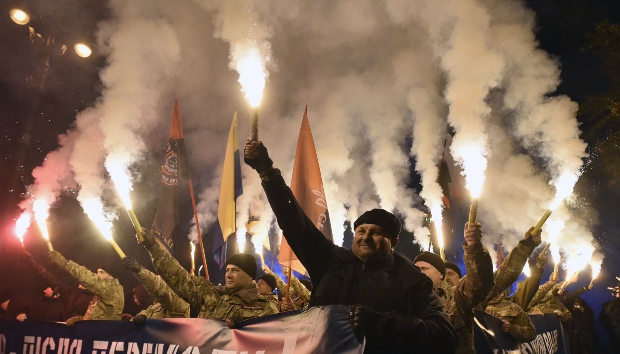 В шесть вечера 14 октября возле памятника Родине-матери в Киеве уже собрались несколько тысяч националистов, большую часть которых составляли люди с символикой «Азова». К ним также присоединились представители запрещенного в России «Правого сектора» и «С-14» — радикального крыла еще одной крупной националистической партии «Свобода», которая свой марш провела отдельно. Многие были в камуфляже; другие — в черной форме и балаклавах с широкими прорезями для глаз. Костяк колонны составляли молодые мужчины, которые держали в руках флаги с символикой «Национального корпуса» — новой политической силы, которая была основана в тот же день на базе гражданского корпуса «Азова» (общественная организация, созданная при полке; занимается волонтерством, набором добровольцев и политической деятельностью).