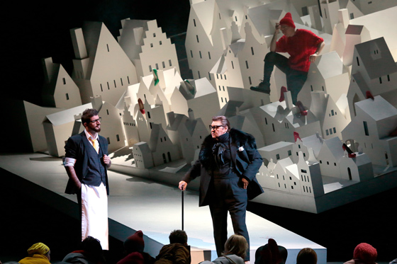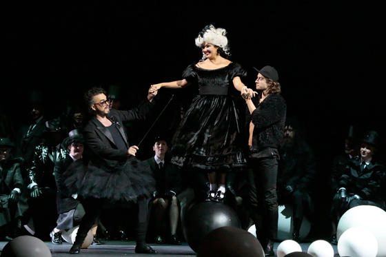 © Дамир Юсупов / Большой театр Чего тут только нет. Влюбленные улетают на воздушном шаре в Париж и уплывают на льдине в Америку. Среди арестантских товарок Манон обнаруживаются культуристка, трансвестит, негритянка в подвенечном платье, толстуха, карлица, женщина-змея. Белый бумажный городок Амьен и белый бумажный кораблик в Гавре противопоставлены черному царству парижской роскошной жизни Манон, в центре которого — огромное, чуть наклоненное зеркало, отражающее сцену, дирижерскую яму и даже первые ряды партера. В тот момент, когда Манон вспоминает брошенного ею ради этого черного будуара нищего студента де Грие, зеркало (благодаря современным сценографическим чудесам) перестает быть зеркалом, и сквозь него просвечивает кусочек утраченного счастья. В сочетании с посерьезневшей Нетребко, вмиг превращающейся из куклы, стервы и подружки оффенбаховской Олимпии в страдающую женщину, эта сцена оказывается очень эффектной.