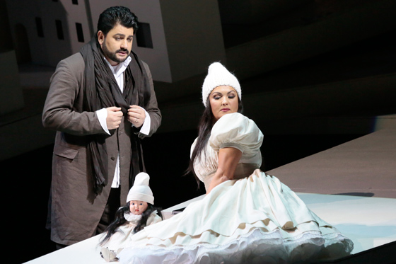Итак, для полного комплекта нужен еще дирижер, заботливый к голосам главных ньюсмейкеров, впервые приспосабливающихся к огромному пространству Исторической сцены. Такой есть — молодой итальянец Ядер Биньямини, приглашенный самой Нетребко. Солисты слышны, рядом с высокими гостями уверенно звучат и местные певцы, особенно исполняющие партии злодеев: богатого старика-сладострастника Жеронта (Александр Науменко) и циничного брата Манон, сержанта Леско (Эльчин Азизов). Хору повезло меньше — его реплики не всегда догоняют слишком бойкий оркестр. Недостаточная аккуратность, впрочем, компенсируется темпераментностью. После Интермеццо в начале третьего действия, знаменитой симфонической зарисовки, рисующей тоску де Грие по арестованной Манон, маэстро церемонно поднимает оркестр в яме на поклон.