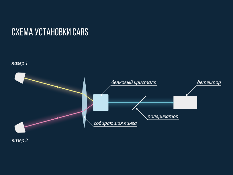 Схематичное изображение установки CARS. Два лазерных луча (лазер 1 и лазер 2) скрещиваются на образце. Сигнал, полученный от высвеченной области, проходит через множество фильтров (в том числе поляризатор) и идёт на детектор. Дальнейшая обработка позволяет сказать, есть в данной области белковый кристалл или нет. Илл.: МФТИ