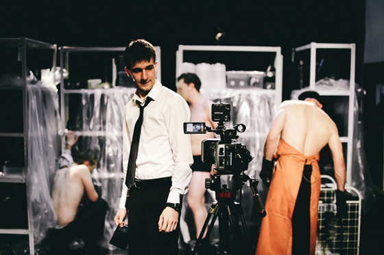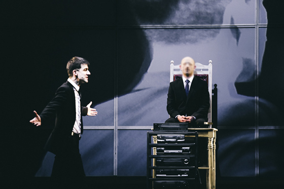 В стерильных и в затхлых жилищах, в судах, в присутствиях — всюду километры пленки, стопки видеокассет. Камеры слежения — везде. Фиксация реальности — обыденный процесс и обыденность Процесса. (Как будто служаки-статисты оставляют отчет для того, кто этот ад курирует. Не факт, что посмотрит, — но на всякий случай.) Все архивируется, а иногда попадает на экран. Это тоже дает намек на то, что хронотоп и устройство мира сложнее, чем кажется. Так, в самом начале транслируются документальные съемки обыска в стильно обставленной комнате К. (сам К. в это время мирно спит в кровати на пустой сцене), а потом двое без лиц окружают подозреваемого необходимой мебелью и только после будят и проводят этот самый — уже отснятый и увиденный — обыск. Так же будет и с казнью К.