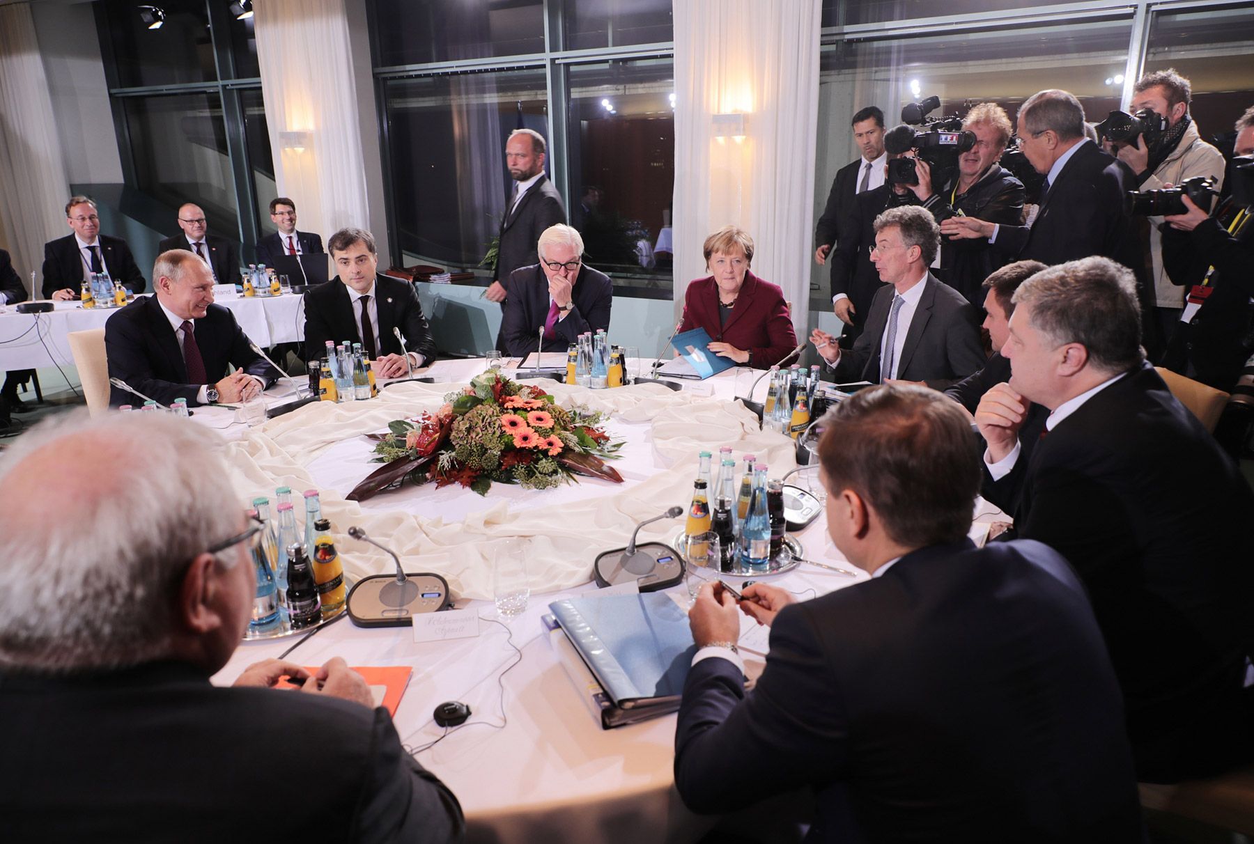 Владимир Путин за одним столом с Ангелой Меркель и Петром Порошенко. Фотография