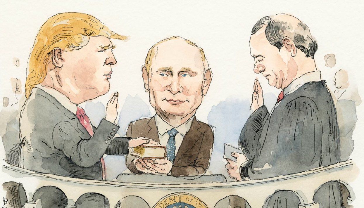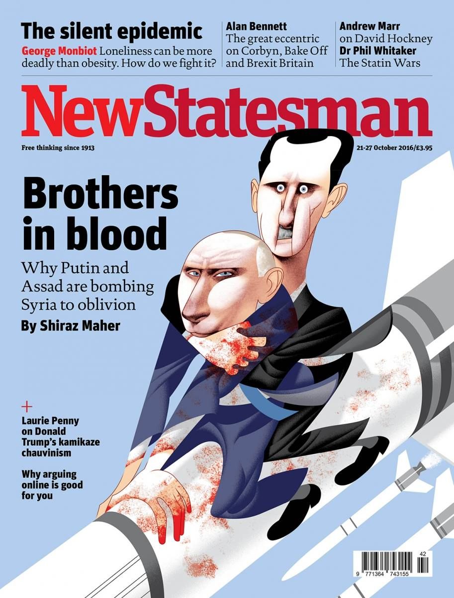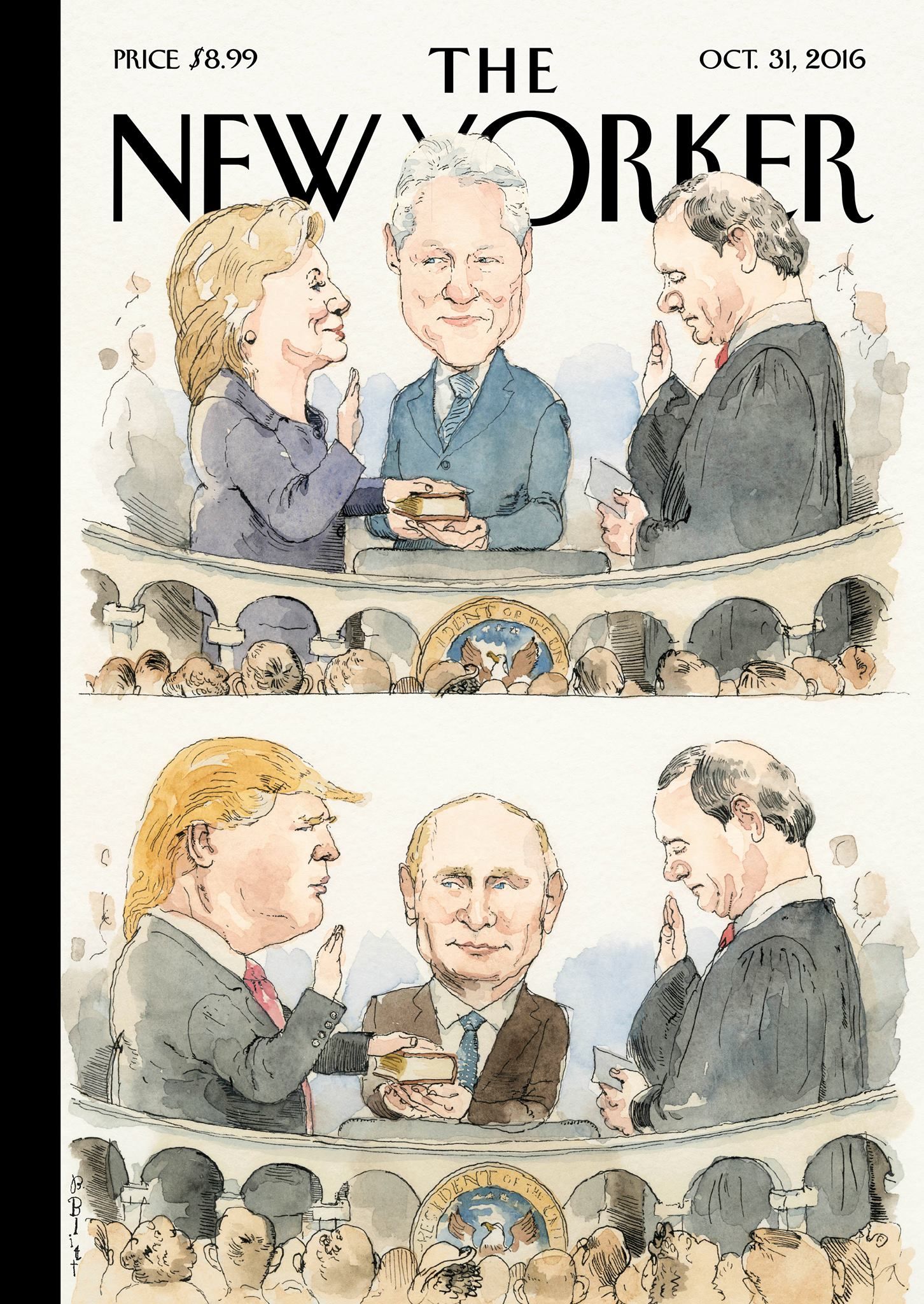 Обложка нового номера американского журнала The New Yorker. Избранный президент США приносит присягу на Библии, которую держит в руках его (или ее) супруга (или супруг). В данном случае в отношении Дональда Трампа и Владимира Путина подразумевается английский афоризм in bed with — быть в сговореThe Economist, английский журнал о мировой политике. Тут, кажется, все понятно: В глазах Путина — истребители, предположительно, обстреливающие АлеппоNew Statesman, еще один английский еженедельник. Это тоже про Сирию: Башар Асад и Владимир Путин — братья по крови (очевидно, пролитой все в том же Алеппо)The Spectator, ведущий британский консервативный журнал. Тут уже речь о противостоянии Владимира Путина с остальным миром — и о том, как с помощью канала RT он ведет с оппонентами пропагандистскую борьбу. Обложка отсылает к каноническому советскому плакату «Родина-мать зовет»