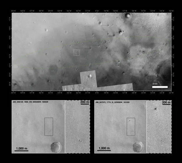 Космический аппарат NASA Mars Reconnaissance Orbiter сфотографировал предполагаемое место падения модуля Schiaparelli. Как сообщает Европейское космическое агентство, на снимках видно, что модуль упал на поверхность Марса с большей высоты, чем планировалось, от двух до четырех километров и, вероятно, был разрушен при ударе.