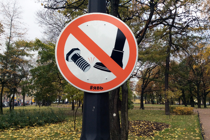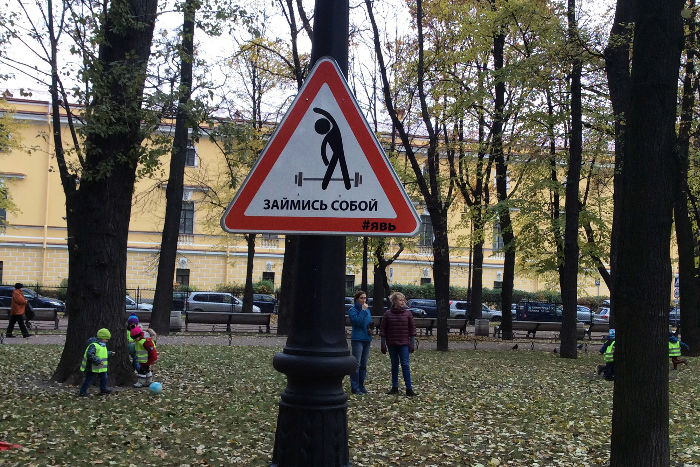 Движение «Явь» развесило по городу альтернативные дорожные знаки «качай мозг», «займись собой» и «не кипятись». Как пояснили активисты, знаки призывают уделять внимание спорту, не злоупотреблять алкоголем, всегда оставаться в гармонии с собой и не «пинать болт».