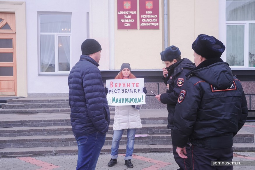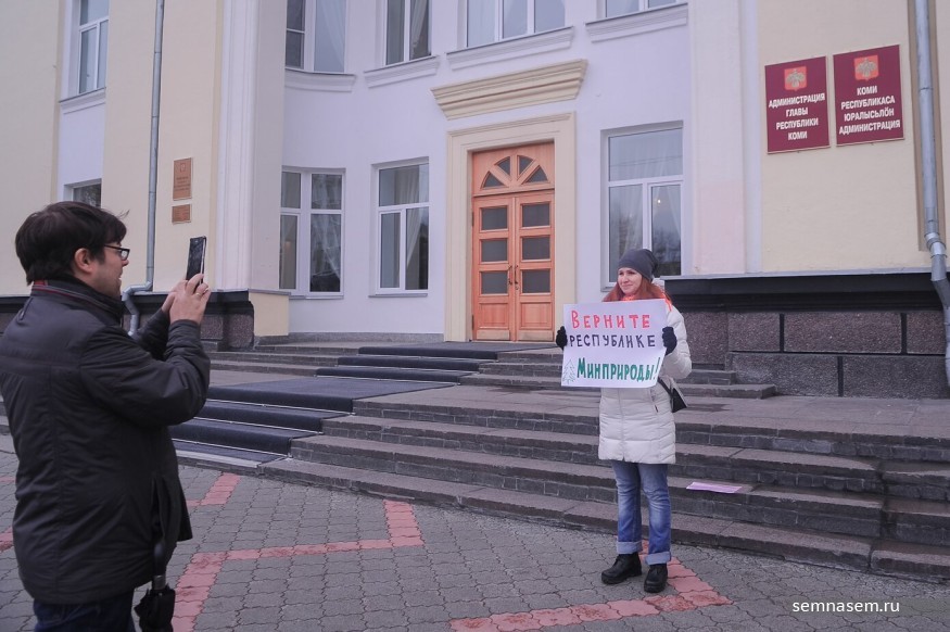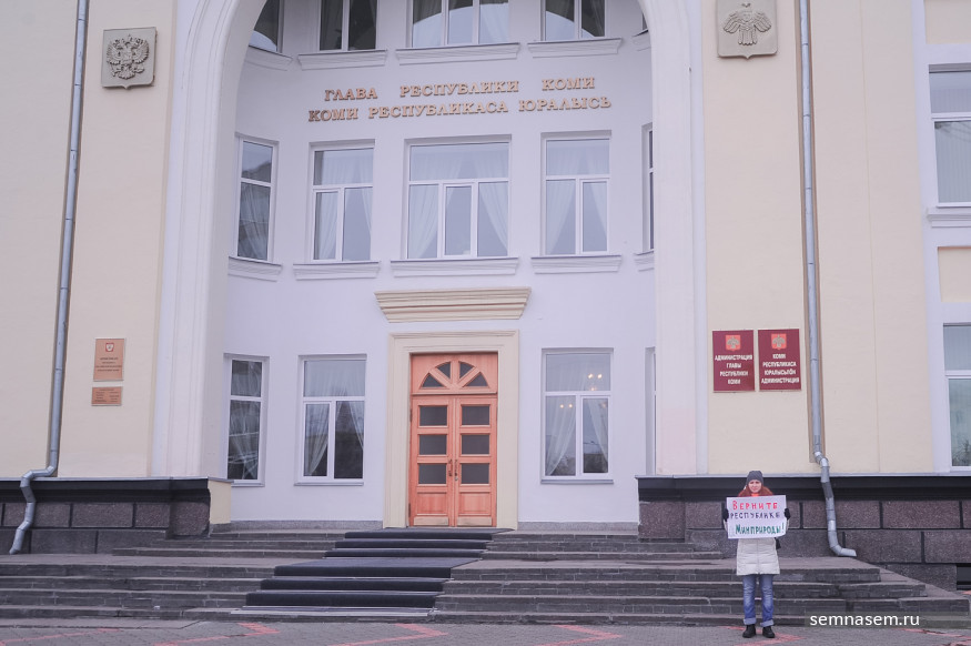 Нина Ананина вышла на пикет от трех общественных организаций — «Экологов Коми», Комитета спасения Печоры и «Изьватас». 21 октября три структуры направили открытые письма президенту России Владимиру Путину, министру природных ресурсов России Сергею Донскому, главе Коми Сергею Гапликову и в Госсовет Коми. В них они просят пересмотреть решение губернатора республики о слиянии министерств. Общественники пообещали организовать серию одиночных пикетов и митингов в городах и районах региона.