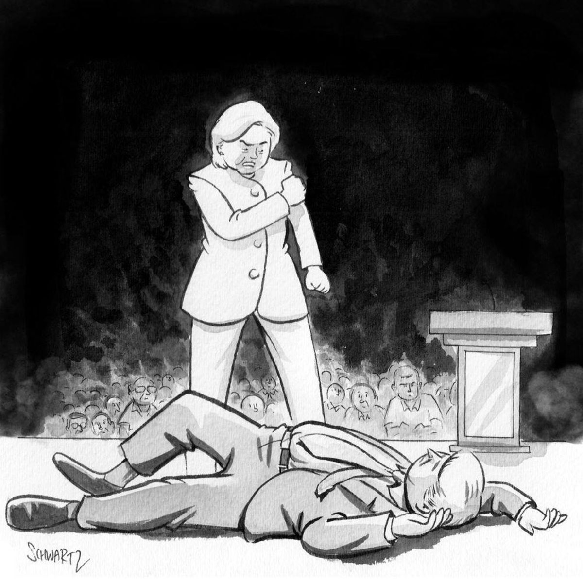Практически каждая женщина хотя бы раз в жизни пережила эти потные руки, это собачье дыхание, это наваливающееся тело, а потому — глядя на Трампа — видела того, которого не сумела с себя снять и от которого потом долго отмывалась в душе, давя слезы злости и омерзения и воображая, как найдет, и — наотмашь. Хиллари и била его наотмашь: пора-зительно, но это торжество сатисфакции — оно передавалось через экран и вызывало восторг: «Ах, молодец, ну, еще его, гниду, еще!» Она была обречена победить, и она это сделала: умно, стильно, даже с некоторым шиком. Кстати, ни в начале дебатов, ни в конце их Клинтон руки Трампу так и не подала.