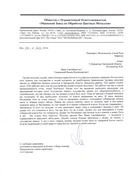 Потеряв надежду на светские власти (все жалобы в вышестоящие органы спущены на места, а тут, понятно, круговая порука), руководство завода обратилось за помощью к патриарху Кириллу.