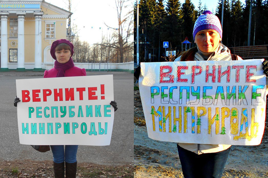 В городе Сосногорске Республики Коми 27 октября с пикетами против ликвидации министерства природных ресурсов и охраны окружающей среды вышли организатор интернет-сообщества многодетных семей «СемьЯ — Сосногорск» Елена Турова и организатор экогруппы «Зеленый Сосногорск» Анна Нестерова, сообщили пикетчики в социальной сети «ВКонтакте».