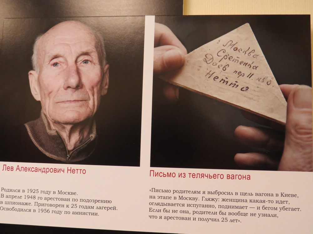 Создателями экспозиции, приуроченной ко Дню памяти жертв политических репрессий в СССР, являются журналисты "Новой газеты" Елена Рачёва и Анна Артемьева. Это коллекция фотографий бывших заключенных и сотрудников ГУЛАГа, которая охватывает временной промежуток с 1937 по 1958 годы. Одни герои выставки в это время были были арестованы по 58-й статье УК за "контрреволюционную деятельность". Другие в этот же период работали в лагерях.