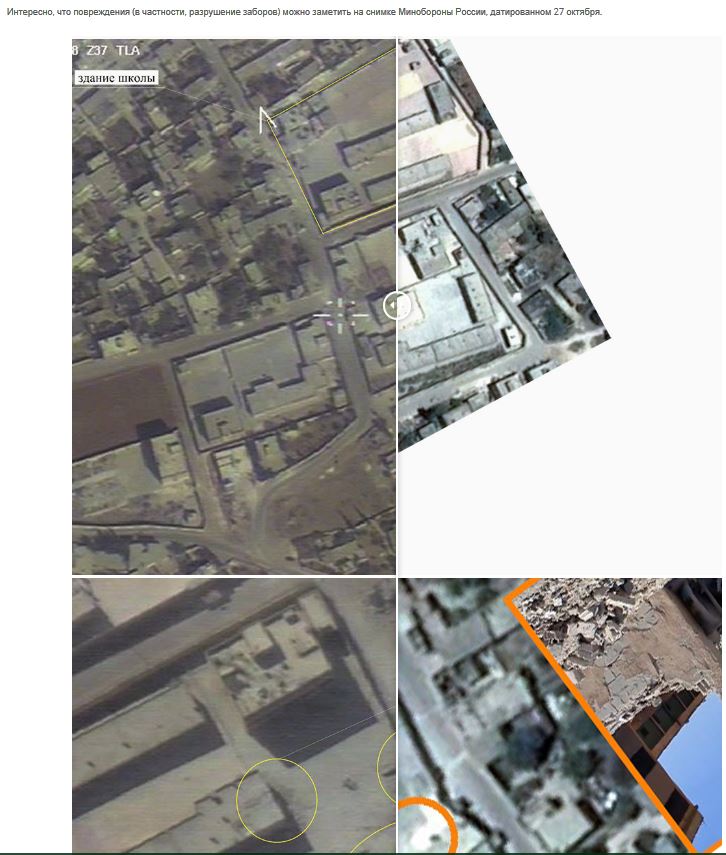 Авторы расследования проанализировали более 20 видеозаписей авиаудара и смогли определить координаты мест, куда попадали бомбы. При этом, как утверждают в Conflict intellegence team, Минобороны представила правдивые спутниковые фотографии этих мест со спутника в доказательство того, что там никаких разрушений нет, однако авторы расследования увидели там частично разрушенный забор: