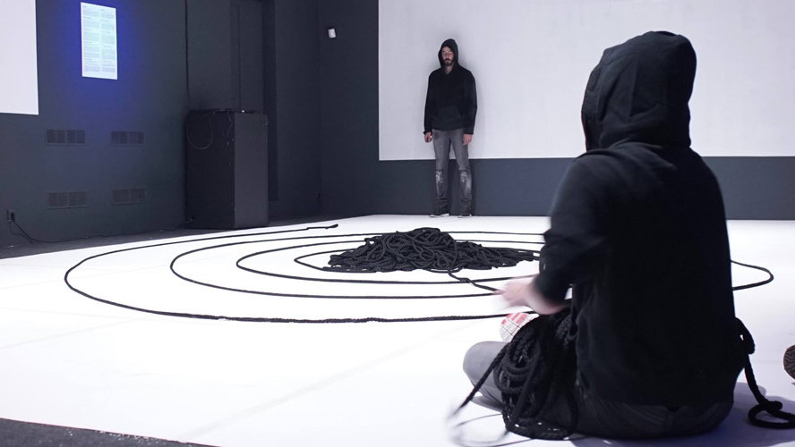 В коммуникации с веревкой — неодушевленным объектом — не всегда понятно, какая она. Сначала веревку двигают, переносят, но после в руках художников она переходит в состояние самостоятельного движения. На протяжении трех дней перформанса коммуникация эволюционирует, становится двусторонней. В какой-то момент веревка превращается в абсолютный, самостоятельный, виртуозный объект. Поэтому любопытно наблюдать за коммуникацией с веревкой, когда художник сам начинает погружаться в нее. Изначально вы понимаете, что Леандро анимирует веревку и набрасывает ее на себя. Но потом кажется, что это веревка захватывает человека, он становится зависимым, скованным в движении. Как только мы перестаем видеть лицо, человек некоторым образом исчезает. Диалог был бы невозможен без двустороннего движения. Так веревка выступает разными метафорами философских вопросов, которые подняты в этом перформансе.