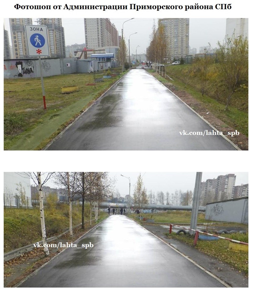 Жители Приморского района Санкт-Петербурга заявили, что фотографии из отчета районной администрации о ремонте пешеходной дороги смонтированы в фотошопе, сообщает «Фонтанка» со ссылкой на сообщество «Лахта Онлайн» во «ВКонтакте».