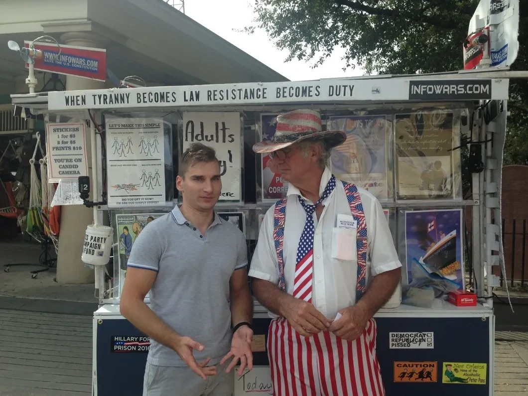 Но места для религии и порядка в Новом Орлеане почти нет — как нет и для политики. С тем, и другим, и третьим здесь все равно выходит карнавал. Вот достучаться до отдыхающего американца пытается одиозный новоорлеанский видеоблогер Майкл Дибари. Со своей тележкой он агитирует во французском квартале за Дональда Трампа. Тележка и одежда у Майкла разрисованы в цвета американского флага. «Трамп вернет Америке силы! Он раскусил замысел мирового правительства и банкиров, желающих уничтожить США. Хотите знать правду, подписывайтесь на меня в YouTube или смотрите канал альтернативных новостей «Раша Тудей»!» — говорит нам Майкл.