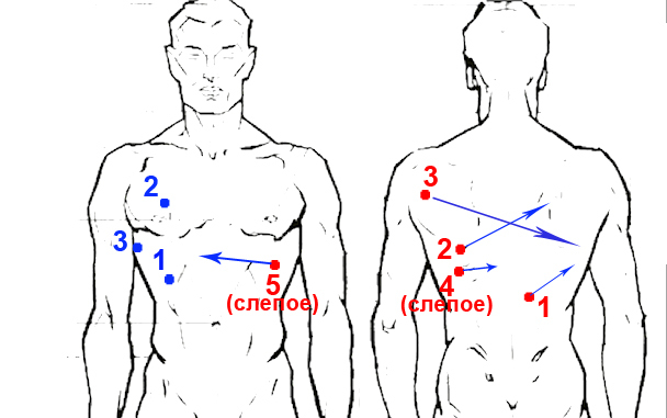 Пулевые отверстия дают более отчетливую картину. Красным обозначены входные отверстия, синим - выходные. Два ранения были слепыми - пули остались в теле. Стрелки показывают пулевой канал.