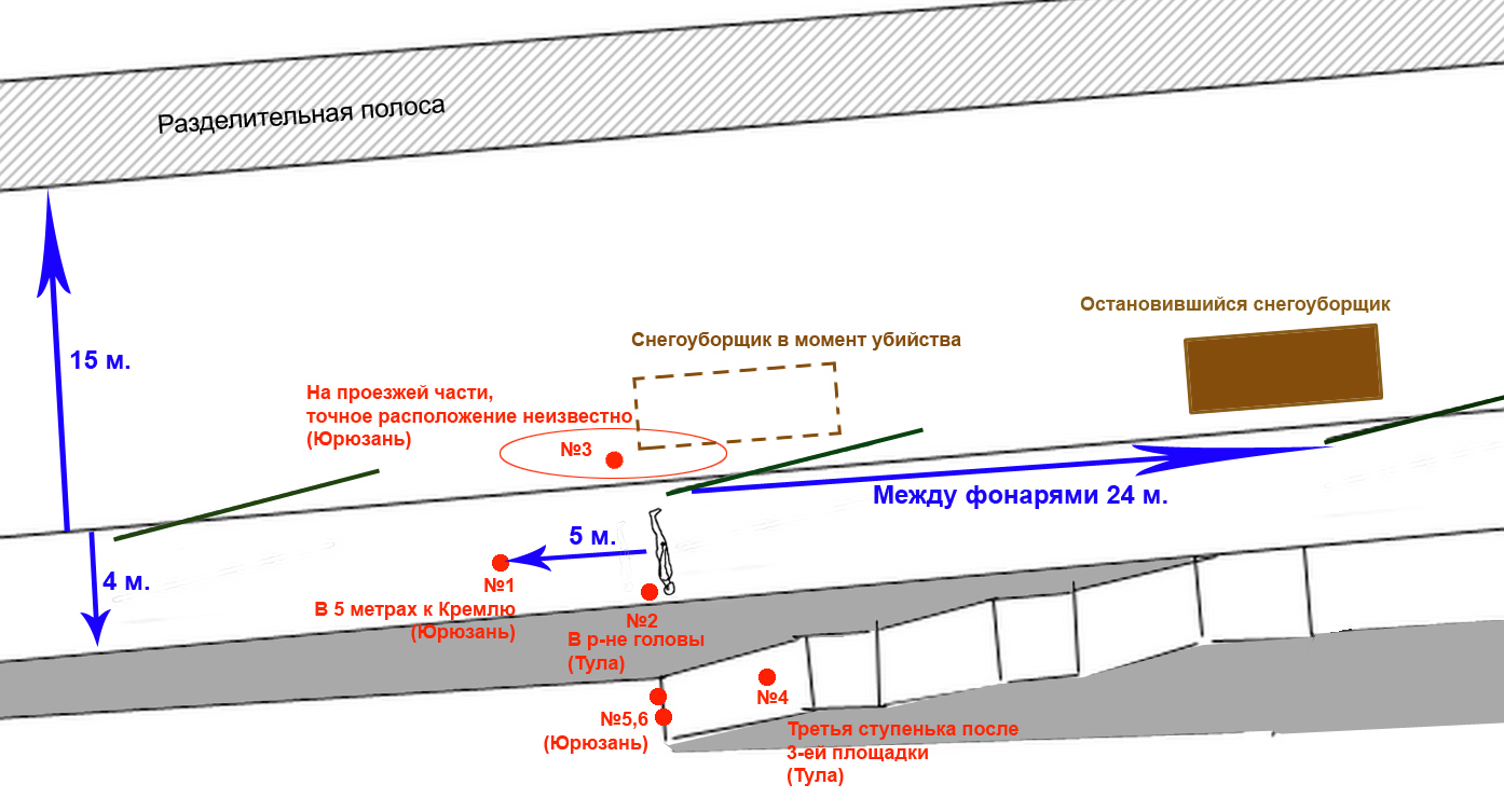 По известной версии, убийца шел за парой Немцов - Дурицкая сзади. Первые три выстрела он сделал в спину, а потом еще несколько, но с ними пока подождем. По схеме можно предположить, что две гильзы у основания лестницы и одна на ступенях - от трех первых выстрелов (гильзы полетели вправо через парапет и вниз). Впрочем, одной из них может быть и гильза №2, ударившаяся в каменный парапет и оставшаяся на тротуаре. Судить по остальным, что произошло потом, я не берусь. Точно, что следующие выстрелы были сделаны совсем с другого направления (гильзы летят вправо) - то ли со стороны проезжей части, то ли вообще справа или сверху. Они лежат в разных местах, и понять трудно. Но гильзы 2 и 1 могли и раскидать ногами ходившие там до прибытия полиции люди. Хотя вряд ли кто-то перенес гильзу №3 с тротуара на проезжую часть через высокий бордюр.