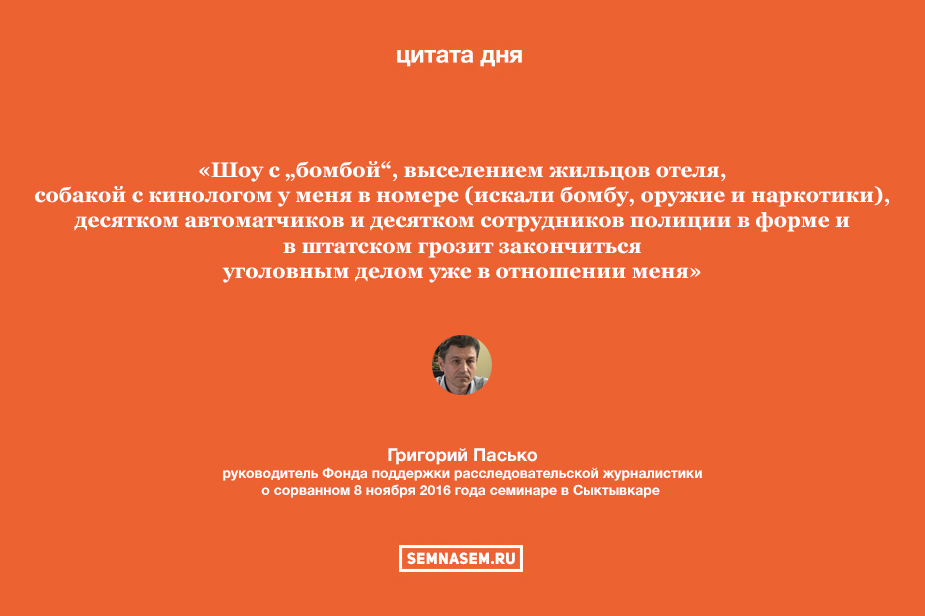 8 ноября в Сыктывкаре был сорван семинар руководителя международной неправительственной организации «Фонд поддержки расследовательской журналистики» Григория Пасько: через час после его начала в отеле «Авалон» участникам сообщили об анонимном заявлении в полицию о бомбе. Всех эвакуировали из здания. Около 20:00 появилась информация, что бомбу не обнаружили. Тем временем, Пасько и его коллега по семинару Игорь Корольков давали показания в полиции. По словам Пасько, ему внушали, что сообщение о бомбе направил именно он.