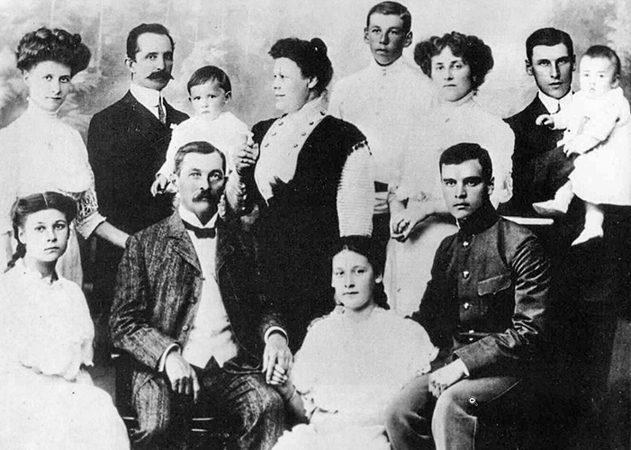 Семья Бринеров, 1914 год. Сбоку от Жюля — его сын Борис, одетый в кадетскую униформу Санкт-Петербургского горного университета