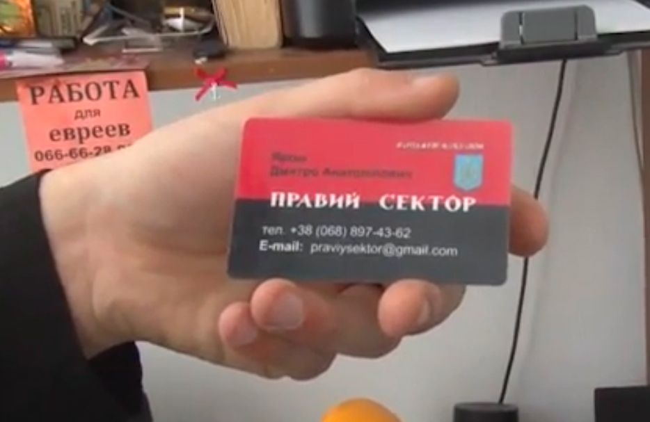 Далее показана сцена обыска, при котором в квартире, помимо оружия, находят визитную карточку лидера запрещенной в России организации «Правый сектор» Дмитрия Яроша.