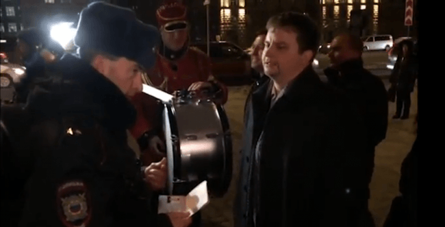 По данным агентства, около здания собралось несколько человек, в том числе духовой оркестр. Музыканты в красной униформе начали играть марш, после чего к ним подошли полицейские, охраняющие посольство, и прервали их игру. Агентство утверждает, что Ведруссов был задержан уже после того, как был составлен протокол о проведении несогласованного мероприятия. Как передает РЕН-ТВ, политолог был доставлен в ОВД «Пресненский». О том, что происходило после этого, не сообщается.