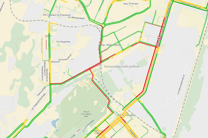 Мы видим, что пробка начинается на кольце на выезде с «Родников» и «Снегирей», идет до улицы Объединения. Там поток разделяется — часть людей едет в пробку на Богдана Хмельницкого, другая часть поворачивает направо (пробка продолжается), дальше часть потока уходит на «лесную дорогу» (пробка), часть — дальше по Объединения. Пробка продолжается — до поворота на Фадеева. А вот по самой Фадеева мимо «Большой Медведицы» — зеленая дорога. Пробки нет.