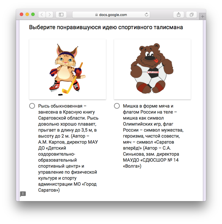 «Из набравшего большинство голосов персонажа сделают ростовую куклу, которая будет принимать участие в физкультурно-оздоровительных мероприятиях и спортивных соревнованиях», — рассказали представители администрации Саратова.