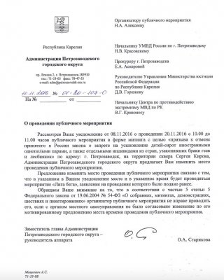 Администрация Петрозаводска отказала в проведении сразу трех мероприятий на ЛГБТ-тематику, которые были запланированы на 20 ноября. Об этом пишет на своей странице в Facebook подававший уведомления Николай Алексеев, московский ЛГБТ-активист, запустивший кампанию по согласованию ЛГБТ-акций в разных регионах России.