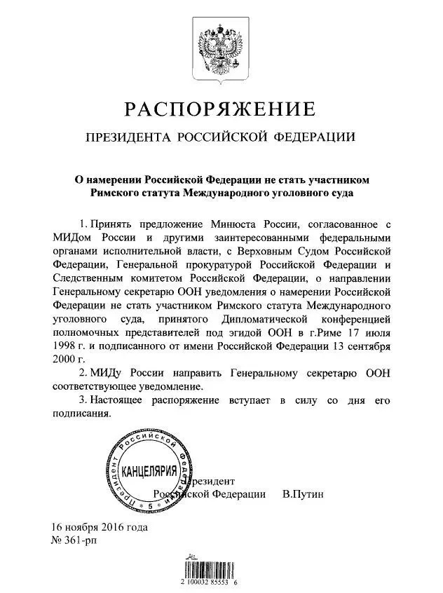 Через два дня, 16 ноября, Владимир Путин подписал распоряжение «О намерении Российской Федерации не стать участником Римского статута Международного уголовного суда».