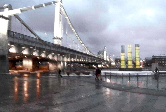 - скульптура Анны Гусевой «Звуки города», разработанная для Крымской набережной. Скульптура делает видимыми окружающие звуки: в ее основе – графическое изображение звуковой волны, которая реагирует изменением цвета и высоты на возникновение различных типов городских звуков (шум машин и проплывающих по реке теплоходов, голоса людей, уличная музыка и т.д.).