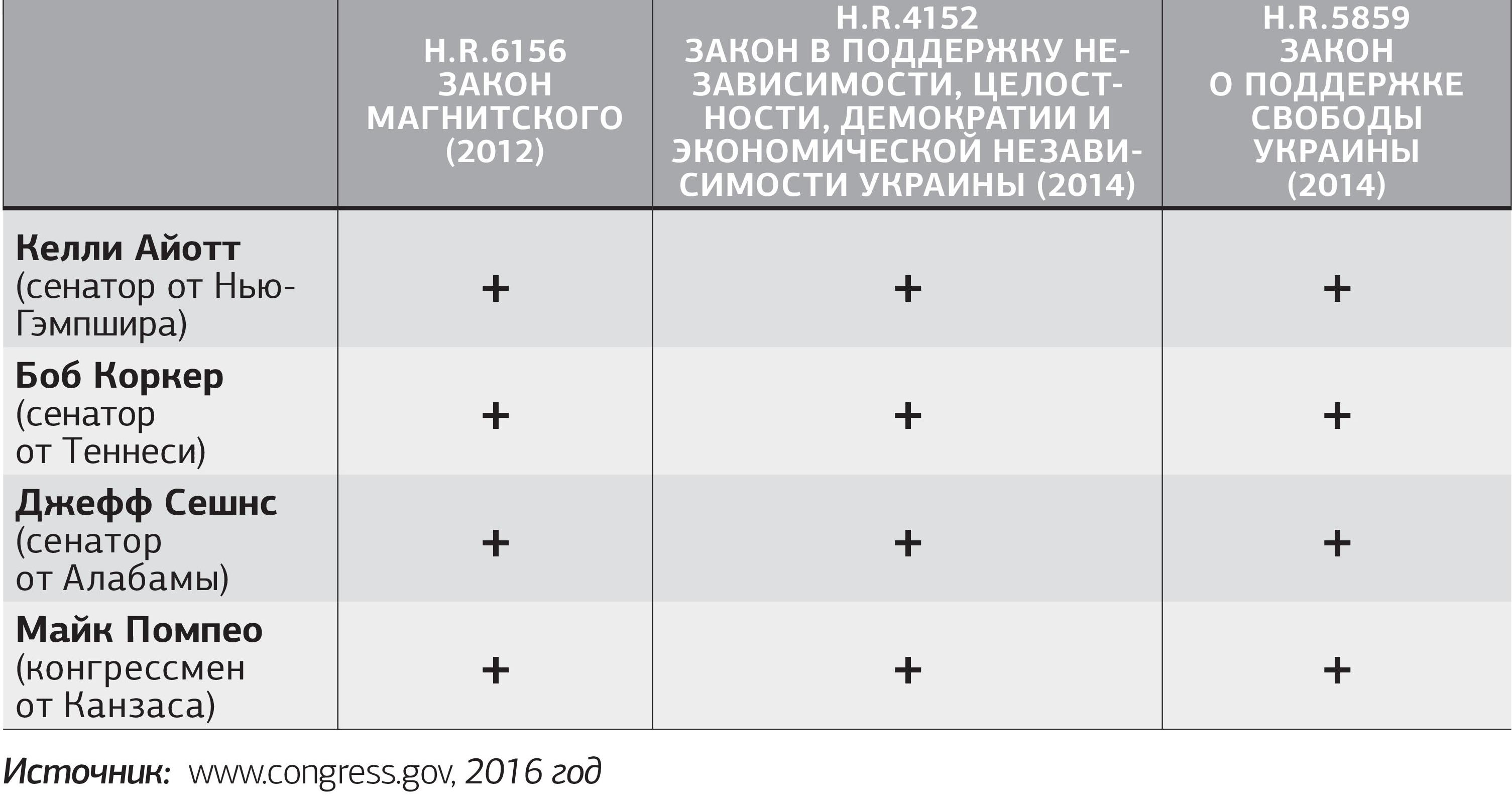 Ключевые места в новой администрации США, которая, как не уставали убеждать население отечественные госпропагандисты, настроена на улучшение отношений Москвы и Вашингтона, уже получили два члена Конгресса. Сенатор от Алабамы Джефф Сешнс — пост министра юстиции и генпрокурора, конгрессмен Майкл Помпео согласился возглавить ЦРУ. Кроме того, сенатор Келли Айотт, только что проигравшая выборы в штате Нью-Гемпшир, рассматривается как кандидат на пост министра обороны, а сенатора от штата Теннеси Боба Коркера, возглавляющего сенатский комитет по внешним делам, прочат в госсекретари. В связи с этим NT решил выяснить, как упомянутые персоны голосовали по законопроектам, ставшим чуть ли не основными раздражителями в отношениях с Москвой. Это в первую очередь «закон Магнитского» (подписан президентом Обамой 14 декабря 2012 года), которым введены персональные санкции против нарушителей прав человека, а также «Закон в поддержку независимости, целостности, демократии и экономической независимости Украины» (подписан 3 апреля 2014 года) и «Закон о поддержке свободы Украины» (подписан 18 декабря 2014 года) — эти документы среди прочего санкционировали выделение Киеву до $1 млрд в качестве займов, возможность введения новых санкций в отношении России со стороны США, а таже поставки украинской армии летального оружия.