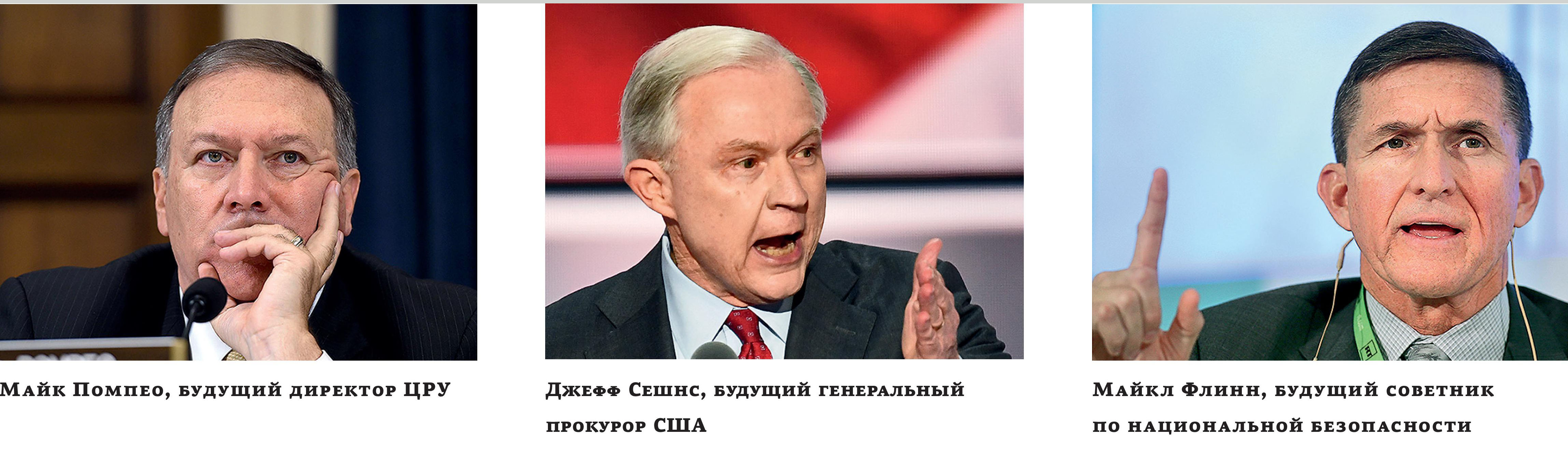 Восемнадцатого ноября стали известны имена новых ключевых игроков будущей администрации Трампа. Генерал в отставке Майкл Флинн, экс-глава разведуправления (NSA) минобороны США, получил должность советника президента по национальной безопасности (он стал широко известен благодаря тому, что оказался платным гостем российского пропагандисткого канала RT — Флинн сидел за одним столом с Владимиром Путиным), сенатору-республиканцу от штата Алабама Джеффу Сешнсу предложено занять пост генерального прокурора, а конгрессмену Майку Помпео — директора ЦРУ. Но если Флинн и Сешнс ключевые члены команды Трампа, им с самого начала прочили важные позиции в новой администрации США, то назначение Помпео для многих стало сюрпризом: на должность директора ЦРУ прочили совершенно другого конгрессмена. Помпео, трижды избиравшийся в Палату представителей Конгресса от республиканской партии, много лет проработал в бизнесе, основал ряд компаний, связанных с военным самолетостроением, а также с оборудованием для нефтяных компаний. В Палате представителей он работал в комитете по разведке и был одним из самых резких критиков решения Обамы подписать соглашение с Ираном.