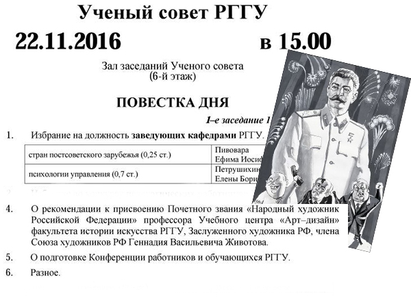 Сегодня утром тема из повестки дня Ученого совета внезапно была снята. По-видимому, ректор РГГУ Евгений Ивахненко, почувствовав недовольство ряда преподавателей и профессоров, решил, что дискуссия на тему (анти)сталинизма на Ученом совете будет не очень своевременной.