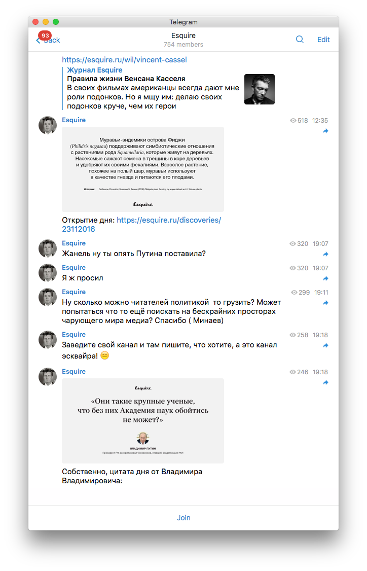 Свой канал в Telegram у Esquire появился только в середине ноября. Не исключено, что переписка выше — просто вирусный маркетинг.
