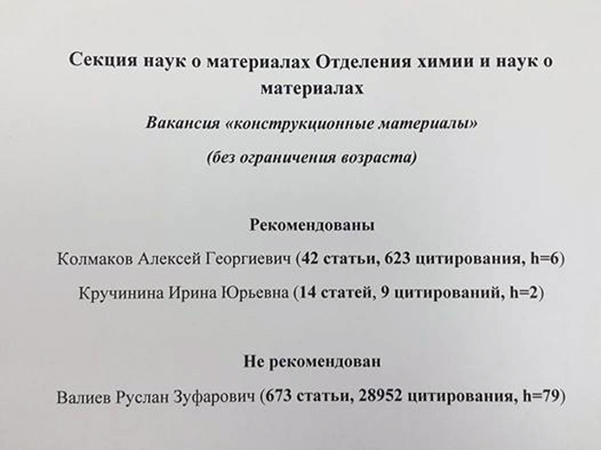 Такую табличку публиковали пользователи соцсетей накануне выборов в РАН. Членкорром РАН был избран Алексей Колмаков.