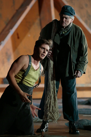Осваивая непривычный оперный стиль, Большой театр снова использовал примерно тот же механизм, что и с прошлогодней генделевской «Роделиндой». Спектакль, в котором, вопреки местным традициям, всего один состав исполнителей, значится копродукцией с Английской национальной оперой (там премьера состоялась в 2012 году) и Немецкой оперой Берлина. Декорации, размещенные на Новой сцене Большого театра, приезжие. Оркестр и хор свои. Западные солисты аккуратно перемешаны с русскоязычными, среди которых главное открытие — молодой и обаятельный минско-киевско-франкфуртский баритон Юрий Самойлов, замечательный Билли Бадд, звезда постановки. Из рядов Большого театра заметнее всего оказался Богдан Волков с отличным легким бриттеновским тенором — он исполняет партию молодого матроса по кличке Новичок. Злодея Клэггарта с увлечением поет бас-баритон Гидон Сакс (родился в Израиле, вырос в Южной Африке, учился в Лондоне, работает по всему миру). Легендарный британский бас старшего поколения Роберт Ллойд мудро украшает спектакль в роли старого моряка, именующегося Датчанином.